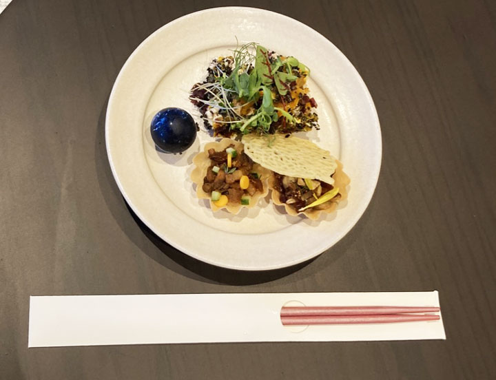 ケータリングをいただく際に使うリユーザブルなお箸は、株式会社 Bo Project.(ボープロジェクト)から提供された。「URUSHI.」と名付けられたこのシリーズは、国産木材を有効活用しているだけでなく、日本の伝統産業である漆を特殊技術とモダンなアレンジで生かしており、これもサステナビリティのひとつの側面に光をあてている。