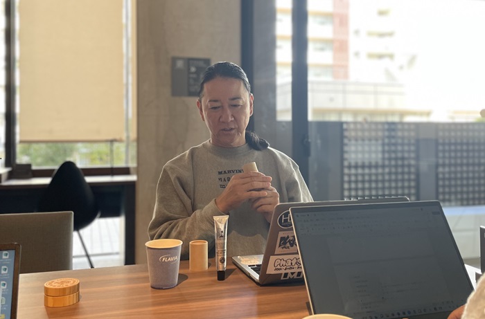 化粧品づくりと音楽制作って実はすごく似ている。音楽制作は、コンセプトに合わせてドラム、ギター、ベースなど楽器それぞれの音源を集めて、それを混ぜ合わせてひとつのパッケージにしていく。そういうプロセスが化粧品づくりと同じです。