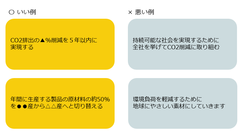いい例で示しているように、客観的かつ定量的なデータや測定方法などを明示することで、企業が目指す社会や環境への具体的な貢献内容が、受け取る側に理解されやすくなります。
