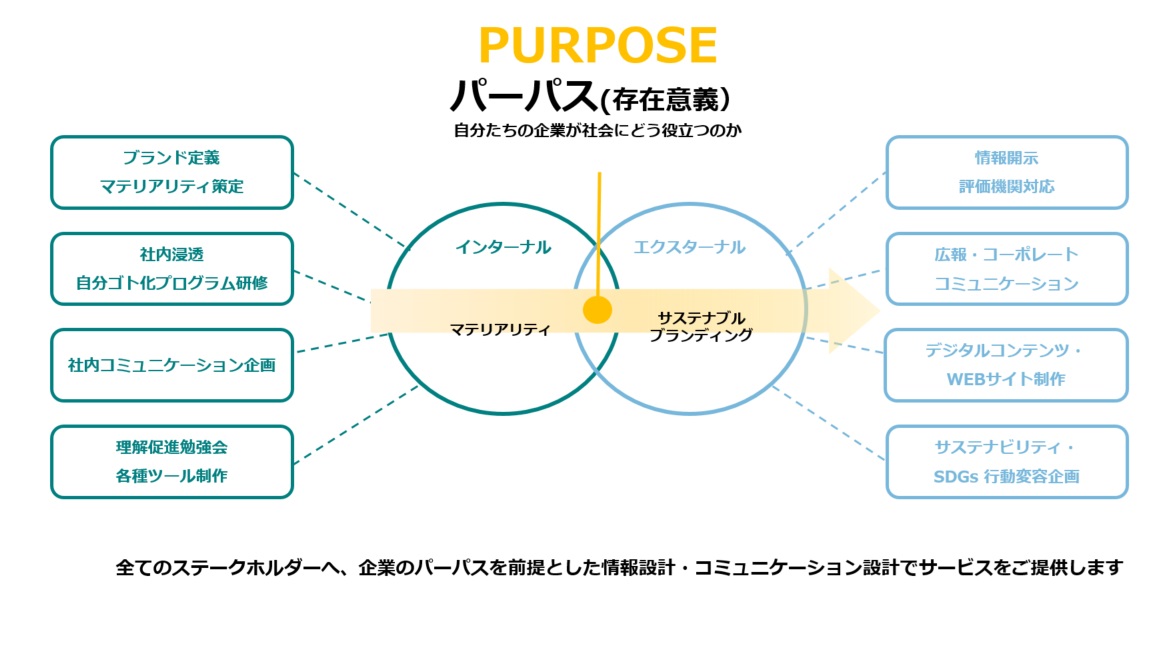 YUIDEAの強みとしては、企業のパーパスを前提にしインターナルからエクスターナルまで、一気通貫した企画提案が行えることです。例えば、インターナルだと社内浸透や社内コミュニケーション企画、エクスターナルだとサステナブルなコンテンツを軸としたウェブサイトやコミュニケーション設計などのご支援が可能です。