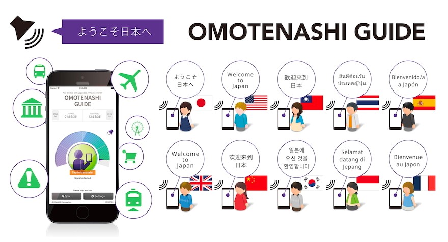 そこで開発されたのが「おもてなしガイド」です。開発したのはヤマハ株式会社で、2016年度のグッドデザイン賞も受賞しています。おもてなしガイドのアプリをスマートフォンに入れ、街中で流れる音声アナウンスを聞かせると、それぞれの言語でアナウンス内容が表示されます。インターネットを必要としないため、災害時にも活用でき情報が届きにくい層にしっかりと情報を届けます。