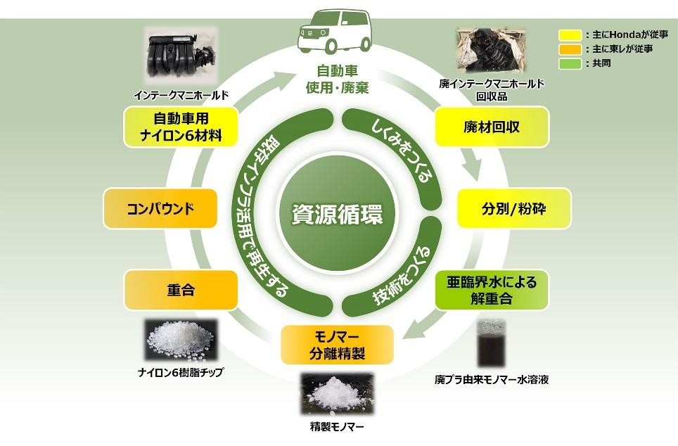 東レ株式会社(以下「東レ」)と、株式会社本田技術研究所(以下「ホンダ」)は、使用済みの自動車から回収するガラス繊維配合ナイロン6樹脂の部品を亜臨界水(高温・高圧状態の水)で解重合し、原料モノマー(カプロラクタム)に再生する、ケミカルリサイクル技術に関する共同開発契約を締結し、技術実証を開始しました。本件は環境省令和5年度脱炭素型循環経済システム構築促進事業(うち、プラスチック等資源循環システム構築実証事業)(補助)に採択されています。