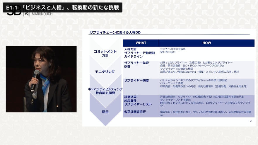 アシックスでは、人権方針の策定からサプライヤーのモニタリング、キャパシティビルディング、情報開示といった流れで人権デューデリジェンスを実施しています。吉川氏の話の中で印象的だったのは、サプライヤーの先にいる労働者への配慮がしっかりとされている点です。