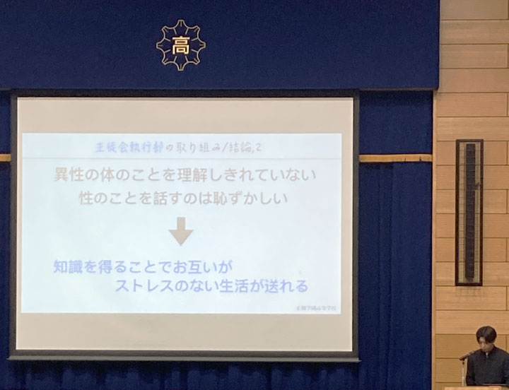 プレゼンテーションのなかで、生徒会長は「男子校だからこそできる性教育とは何か?」そして「自分たちができる取り組みとは何か?」という問題提起から、「正しい知識を得ることで、お互いがストレスのない生活が送れるのではないか」と意見を述べた。さらに、性教育=下ネタとして捉えてしまい、真面目に話せなくなる男子高校生の現状を課題と捉え、「このまま異性の体や性について正しく学ばないまま社会に出たらとても危険。自分の無意識の行動や言動が知らない間に人を傷つけることがあり、DVやハラスメントにつながりかねない。男子校だからこそ異性への理解は必要」だと生徒たちに訴えた。