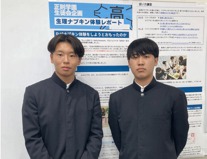 (「生理や更年期で困っている女性が身近にいたら、さりげない配慮のできる男になりたい」と語る生徒会会長Kさん(右)と副会長のSさん(左))