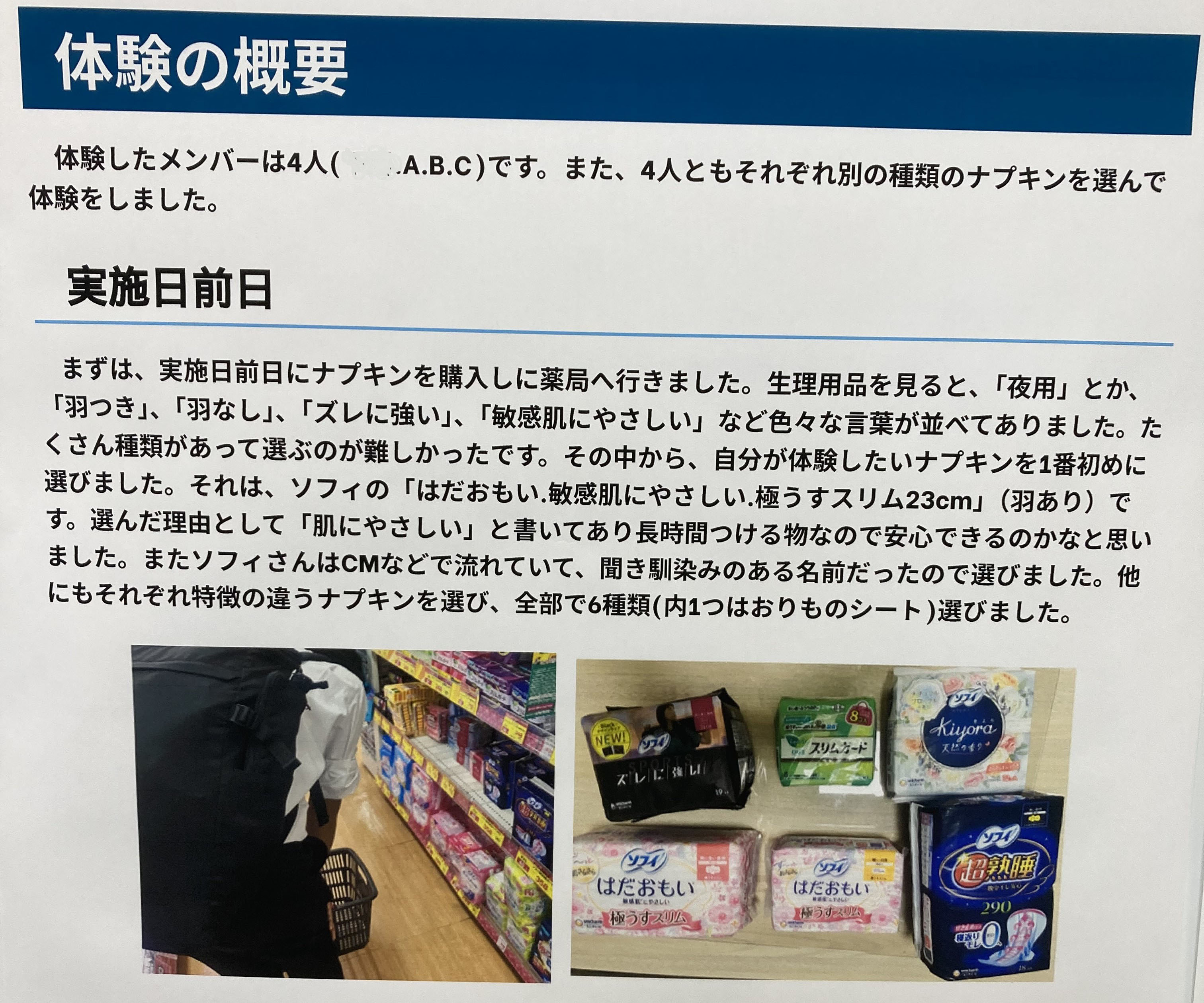 2024年11月に行われた文化祭の展示では、男子高校生がどれくらい異性に関する正しい知識を持っているのかを把握するために、全校生徒を対象として女性の健康課題に関する知識を問うアンケートを実施。さらには有志の生徒による「生理ナプキン体験」など、授業の内容から一歩踏み込んだ学びの成果が掲示された。