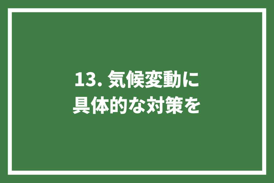 「SDGs13. 気候変動に具体的な対策を」では、「気候変動とその影響に立ち向かうため、緊急対策を取る」ことを目標としています。