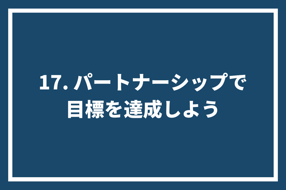 「SDGs17. パートナーシップで目標を達成しよう」では、「持続可能な開発に向けて実施手段を強化し、グローバル・パートナーシップを活性化する」ことを目標としています。