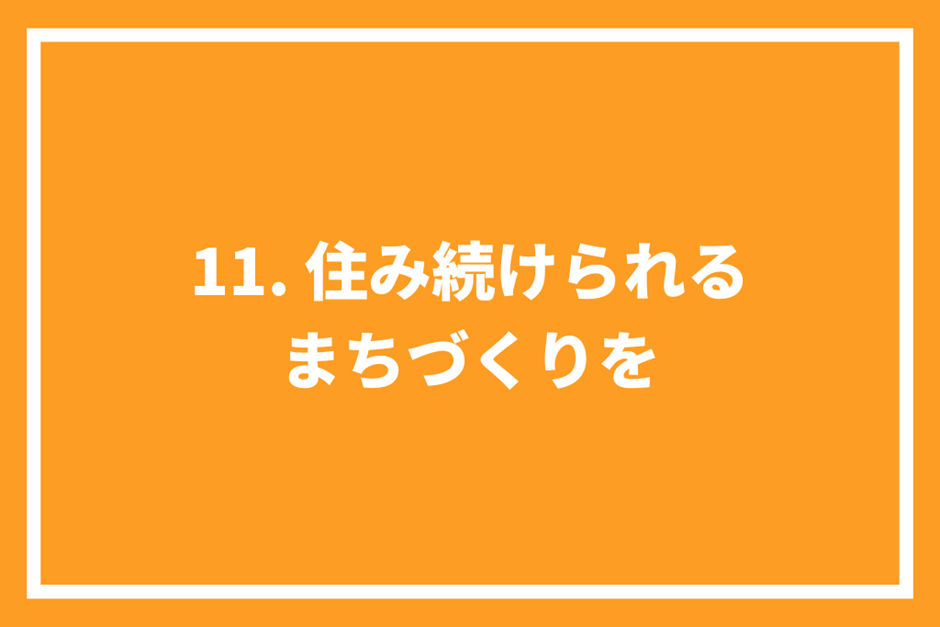 「SDGs11. 住み続けられるまちづくりを」では、「都市と人間の居住地を包摂的、安全、強靭かつ持続可能にする」ことを目標としています。