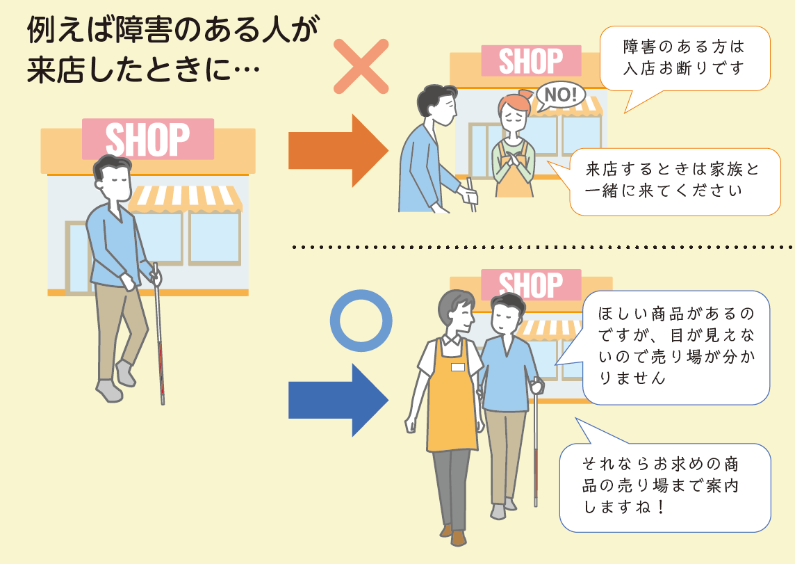 目の見えない人がお店を訪ねた時に「家族と一緒に来店するか、開店すぐに来てください」と入店を制限したり、障害のある人からの問い合わせや呼び掛けにおざなりに対応したり、車いすの方が飲食店を訪ねた時に「車椅子で着席できるスペースはありません」と入店を断ったりするのは、「不当な差別的扱い」に該当します。
